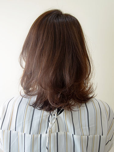 重めミディアムヘアにふんわりとしたパーマをかけてエアリー感満載に!透明感たっぷりのカラーリングと内巻き外巻きをミックスさせたカールでボリュームの中に抜け感を与えるのが今っぽいです。