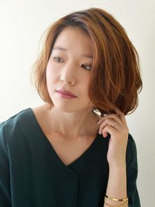前髪は分け目をつけ隙間をつくり、縦の割合をだして、サイドはふんわりとした丸みのあるひし形シルエットに仕上げることで丸顔が補正されます。後ろに向って丸く頭の形をだしているので絶壁カバーにもなります。毛先にワンカールつける事でスタイリングが簡単になるので朝の貴重な時間を有効活用できちゃうのでは…☆