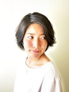 カット:前下がり気味のボブです。ベースカットは内巻きにも、外ハネにもできるようにカットしています。トップにはふわっとボリュームが出るようにレイヤーカットを入れています。動きの出やすいカットをしているのでスタイリングがとても楽です!