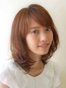 前髪は分け目をつけ隙間をつくり、縦の割合をだして、サイドはふんわりとした丸みのあるひし形シルエットに仕上げることで丸顔が補正されます。後ろに向って丸く頭の形をだしているので絶壁カバーにもなります。